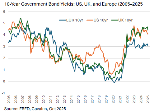 Over the past two years, both US Treasuries and UK gilts have traded around 5% yields at their peaks — with US 10-year yields reaching 5% in Oct 2023, but gilts around 4.9% this year. Since then, yields have eased to around 4.0% and 4.4%, respectively, still leaving long term bond investors with one of the most attractive starting points for high-quality fixed income in more than a decade.